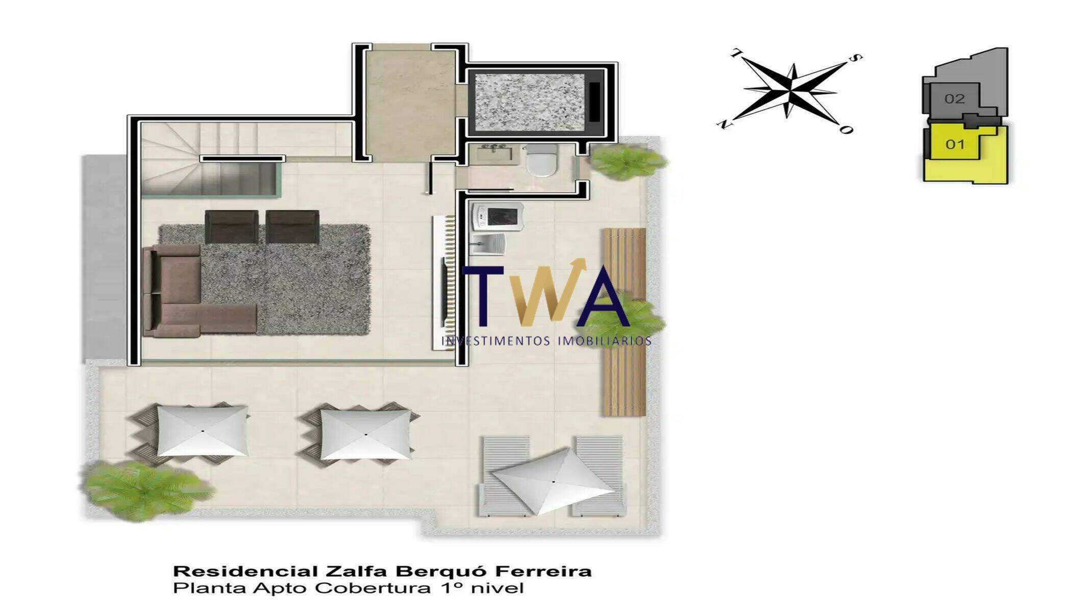 Além do design contemporâneo, o paisagismo e a iluminação cênica trazem à fachada do empreendimento os diferenciais do padrão alto luxo. O projeto arquitetônico exclusivo, com acabamentos como pele de vidro, garante ao mesmo tempo requinte e contemporaneidade a esse empreendimento. O edifício de torre única, conta ainda com hall decorado e elevador.