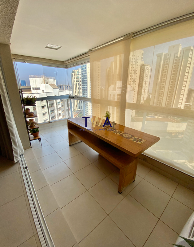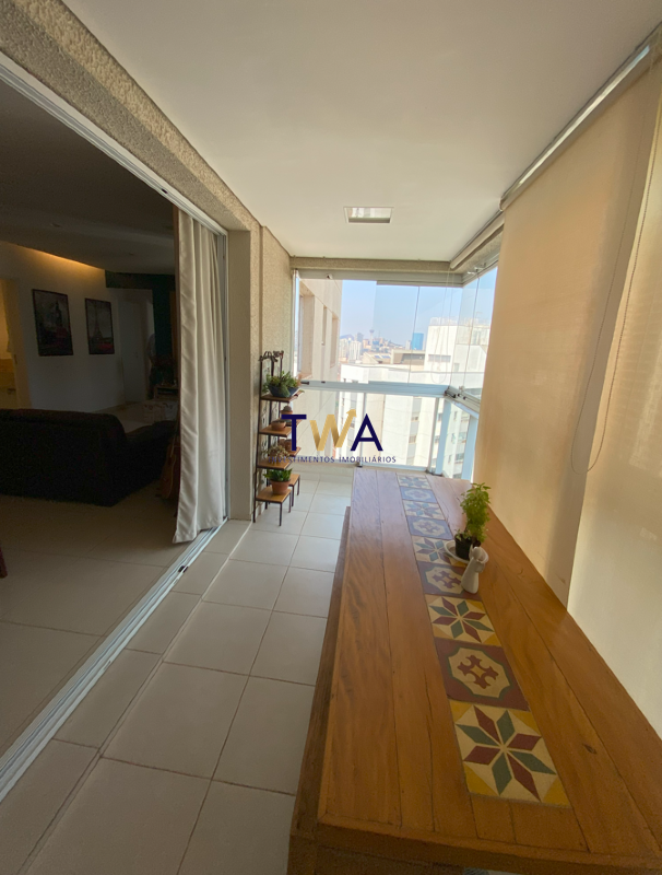 Varanda com cortina de vidro, espaçosa e bem ventilada.