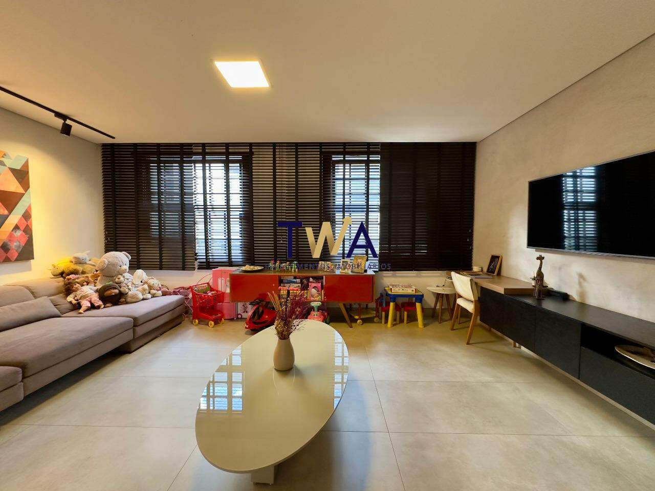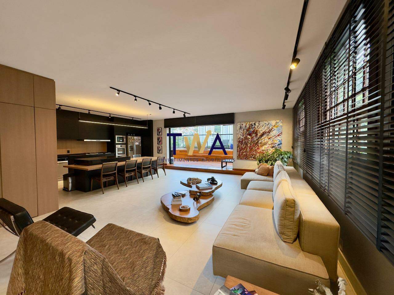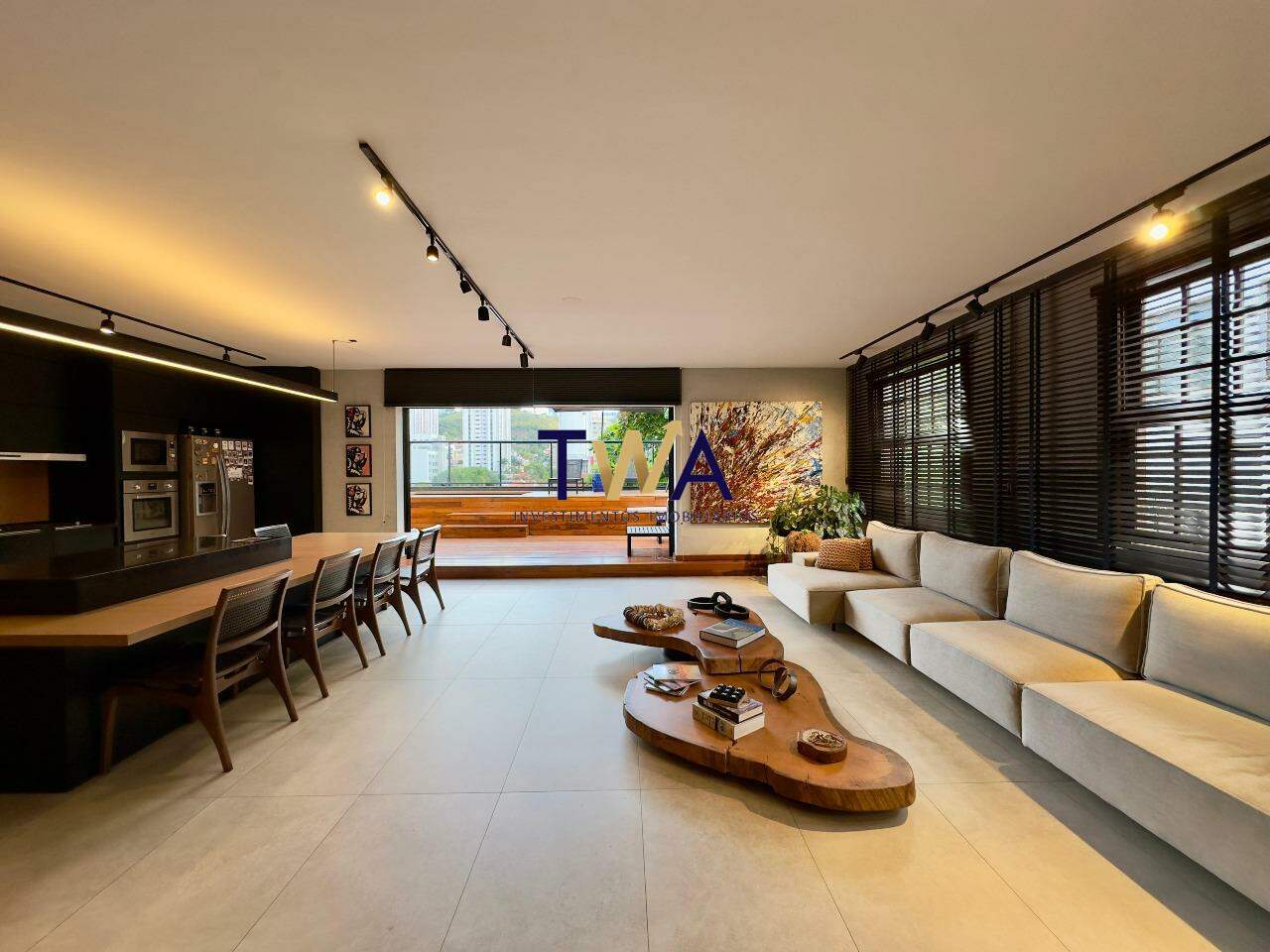 Duas salas generosas, perfeitas para receber ou relaxar, com piso em porcelanato Portobello e janelões de madeira natural, complementados por elegantes persianas Kazza.