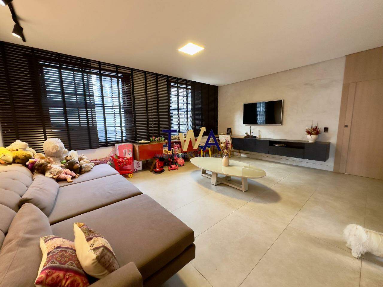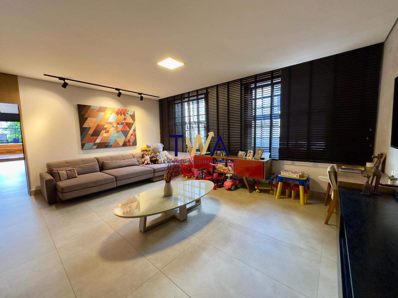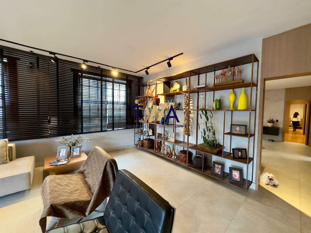 Duas salas generosas, perfeitas para receber ou relaxar, com piso em porcelanato Portobello e janelões de madeira natural, complementados por elegantes persianas Kazza.