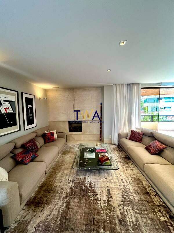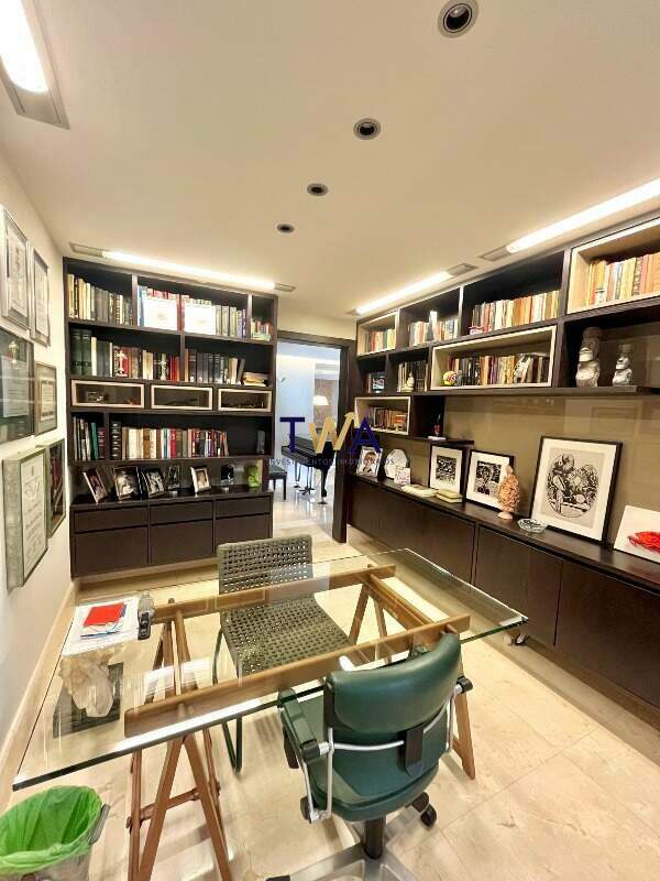 Ampla sala para 04 ambientes, com piso em mármore, projeto de iluminação, lavabo, escritório e varanda gourmet.