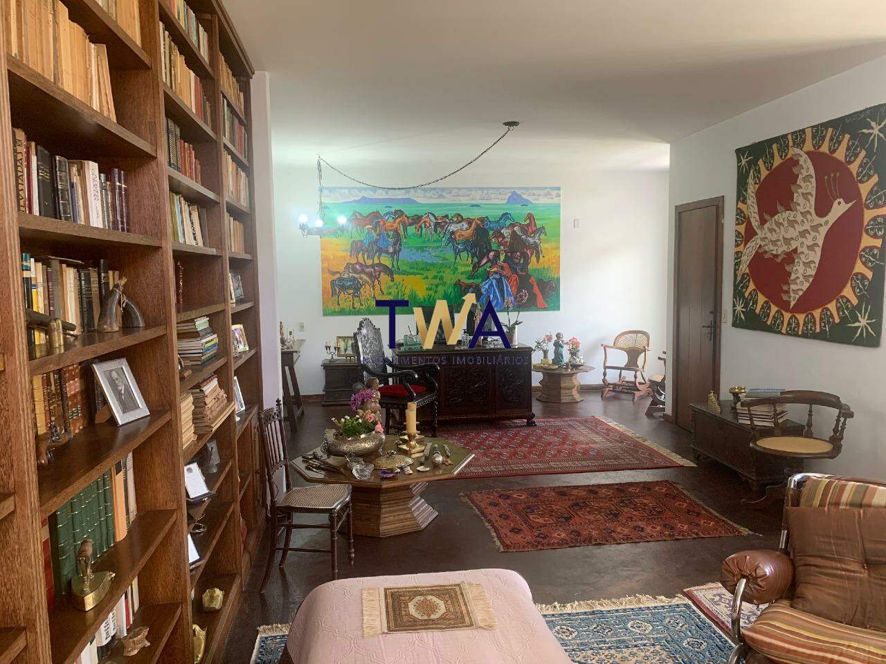 Com dois acessos sociais - Cinco quartos com armários - dois andares com dois amplos salões - duas salas - quatro lavabos - três banheiros sociais - varandas com vistas maravilhosas - duas cozinhas sendo gourmet - duas amplas áreas de serviço - ampla adega no subsolo - Biblioteca planejada para 4000 livros - quatro vagas de garagem - piscina - quintal com árvores frutíferas - canil para cachorros de grande porte.